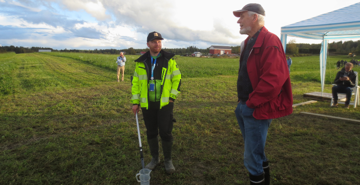 Retken yhteydessä kosteikolta otettiin vesinäytteet. Kosteikolle tulevasta ja sieltä lähtevästä vedestä tutkitaan muun muassa sähkönjohtavuutta ja selvitetään veden kiintoaine- ja ravinnepitoisuudet. Maanomistaja Ville Nuora kuvan vasemmassa reunassa.