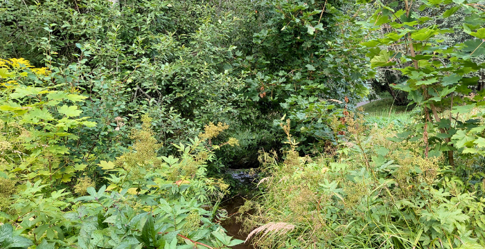 Äkkiseltään tuntuu uskomattomalta, että kasvillisuuden keskellä virtaavassa purossa voisi uiskennella taimenia. Kuva Vuohenojalta: Sami Ojala
