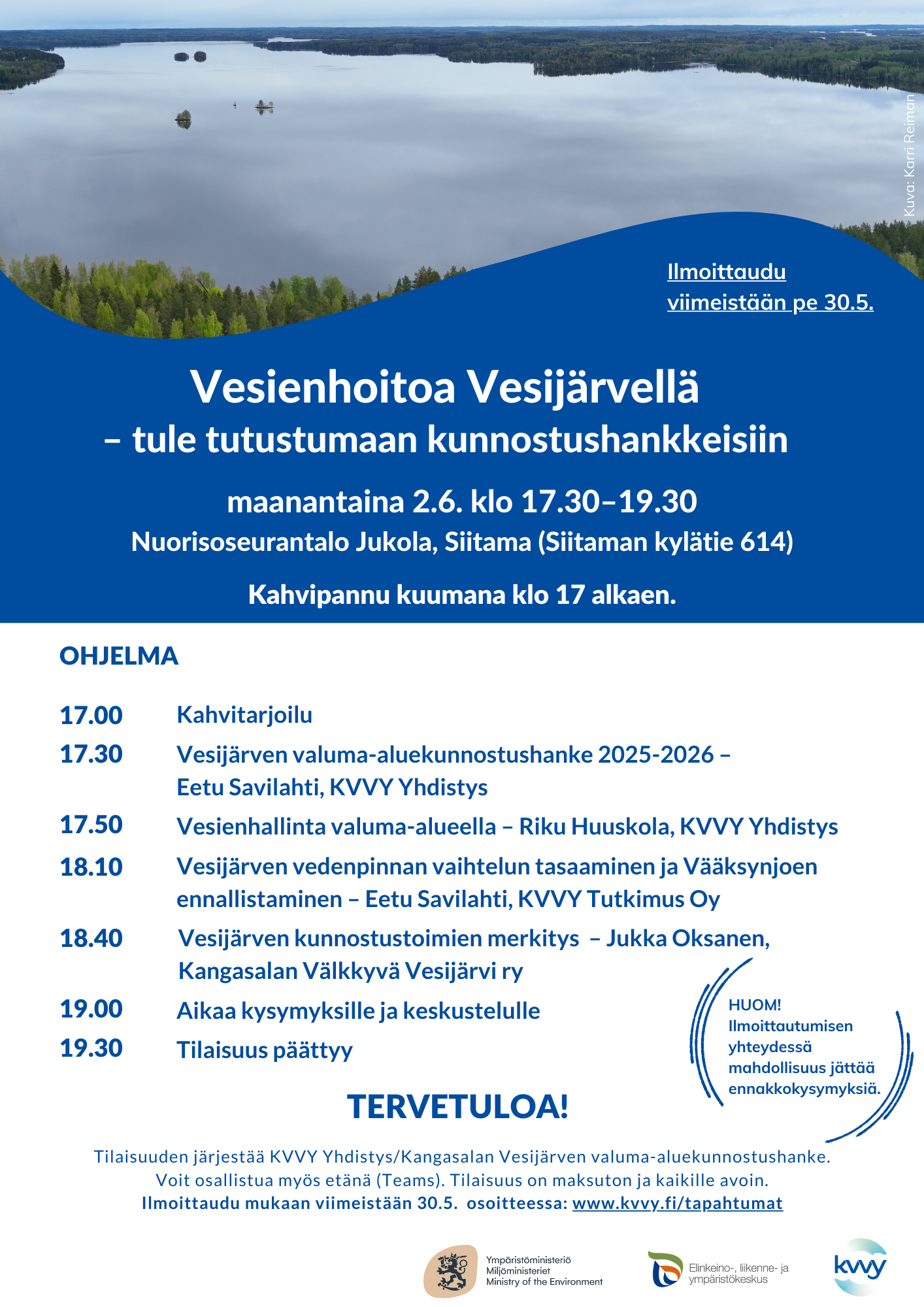 - 2.6. Vesienhoitoa Vesijärvellä – tule tutustumaan kunnostushankkeisiin klo 17–19.30 Nuorisoseurantalo Jukola, Siitama (Siitaman kylätie 614, Orivesi). Tilaisuudessa kerrotaan mm. Kangasalan Vesijärven valuma-alueen kunnostushankkeesta. Tutustu ohjelmaan. Kahvitarjoilu alkaa klo 17, varsinainen ohjelma klo 17.30. Teams-linkki löytyy tästä. Ilmoittaudu viimeistään pe 30.5.